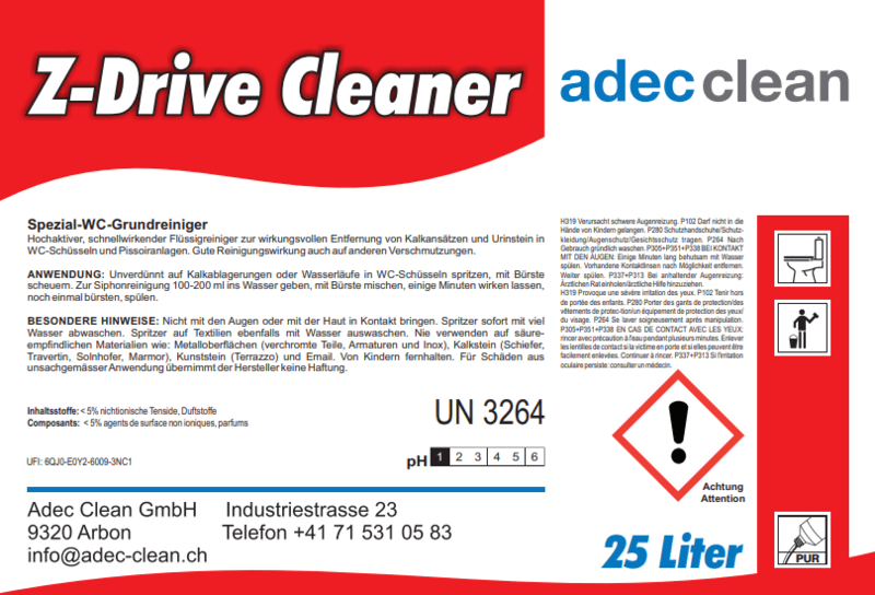 - Inhaltsstoffe: anorganische Säuren, nichtionische Tenside, Duftstoffe, Wasser